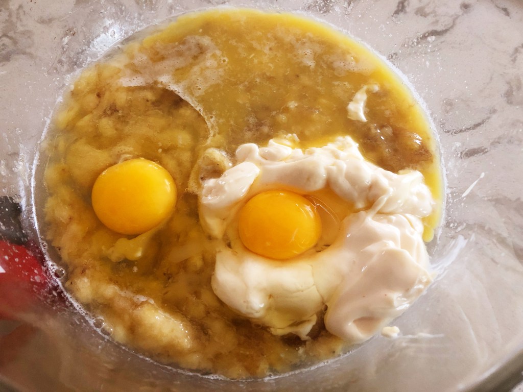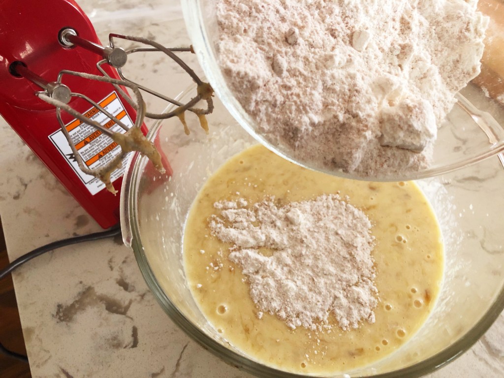 - Add the flour mixture in two additions, to the banana mixture until well combined.