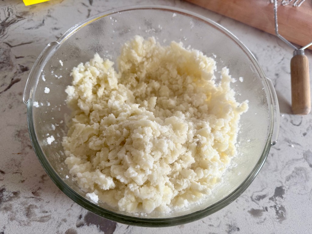 - When the potatoes are ready, drain and place in a serving bowl. Using a potato masher, coarsely mash the potatoes into chunks.