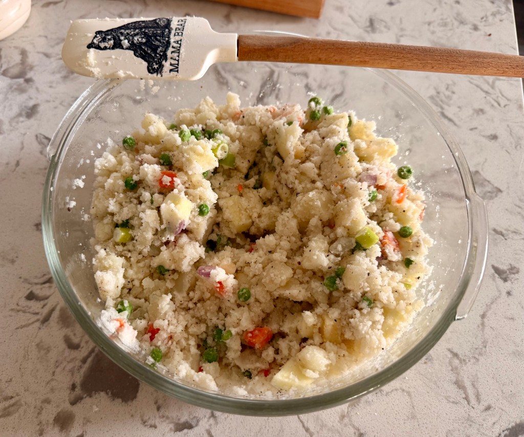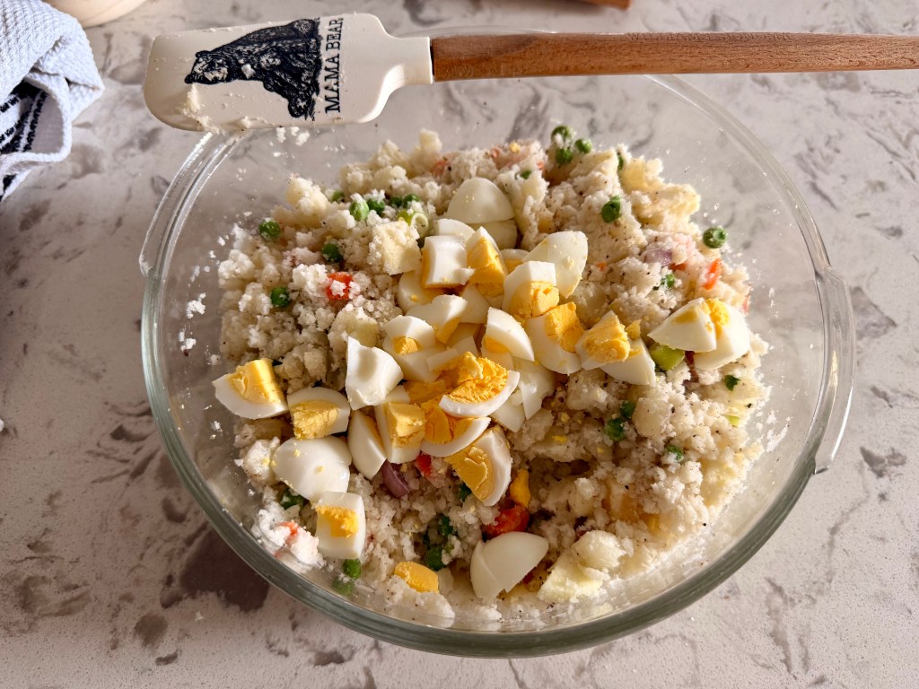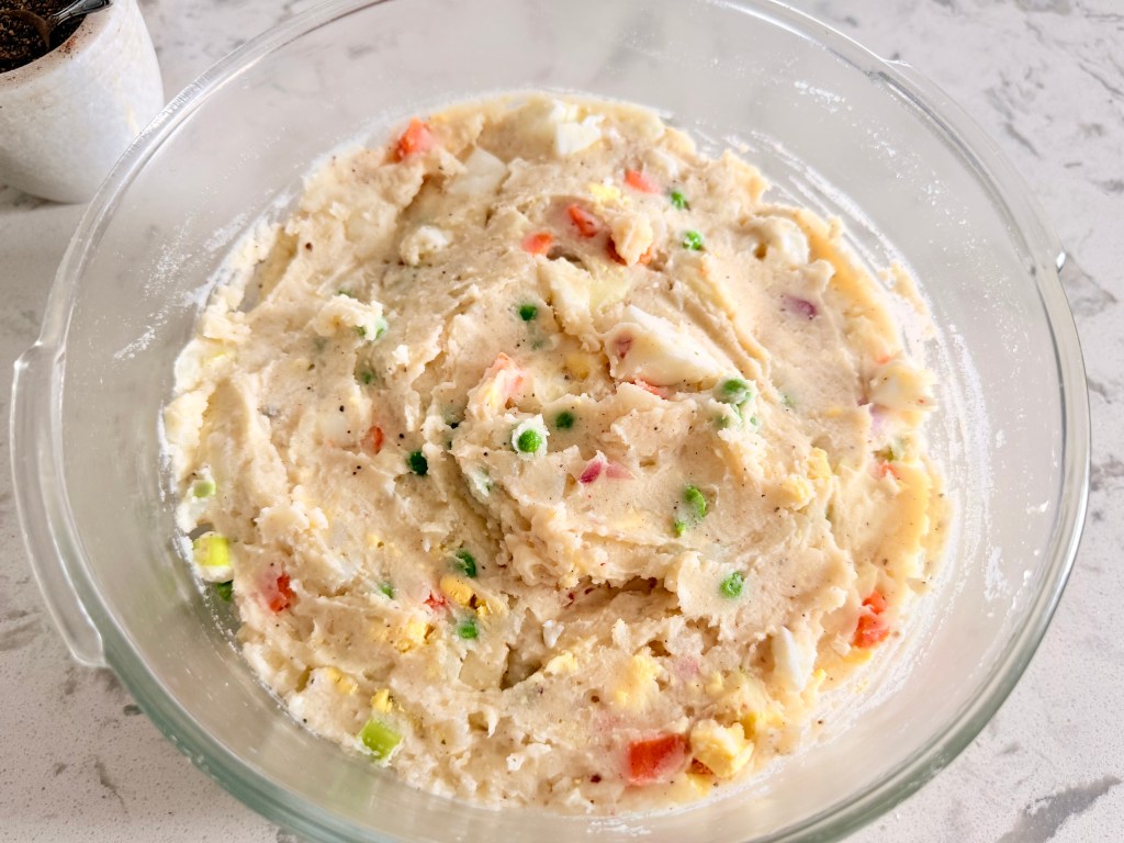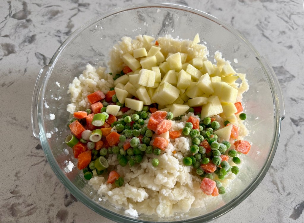- Fold in the chopped eggs, cup of frozen peas and carrots, chopped onion and apples while the potatoes are still hot