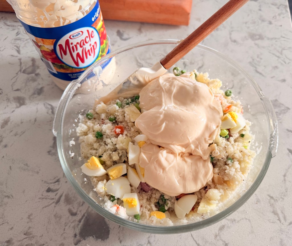 - Fold in the Miracle Whip and season with salt and pepper